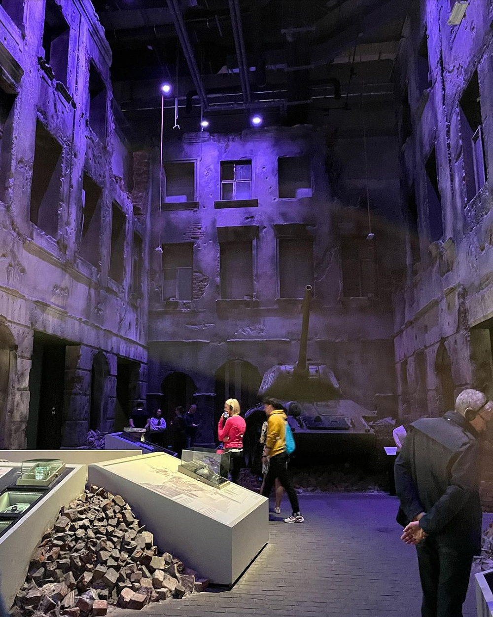 Архітектура музею дійсно вражає, роздивлятися будівлю хочеться з усіх боків, і з усіх боків вона прекрасна. А ще цей музей — справжнє підземне місто, яке веде вас хронологією історії від самого початку, коли Друга світова ще не почалася, до самого кінця війни з усіма її підсумками й страшною тінню. Неодноразово наверталися сльози, коли бачила кадри, схожі на усі ті жахи, що кояться зараз у нас в Україні, чи чула звуки вибухів і сирен. Для поляків це історія, для нас — страшна реальність.