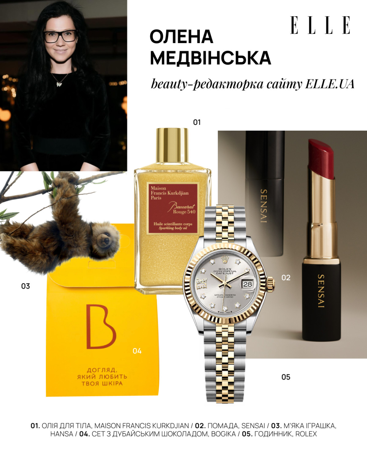 У новорічну ніч хочу нафарбувати губи помадою Sensai Lasting Plump Lipstick, яка одночасно забезпечує стійкий блиск, насичений колір і комфорт. Також обов’язково нанесу на тіло розкішну мерехтливу олію Baccarat Rouge 540 Body Oil від Maison Francis Kurkdjian. Зберігаючи інтенсивність і якість оригінального аромату, вона створює особливу святкову атмосферу й дарує те неоціненне відчуття «жінки на мільйон».