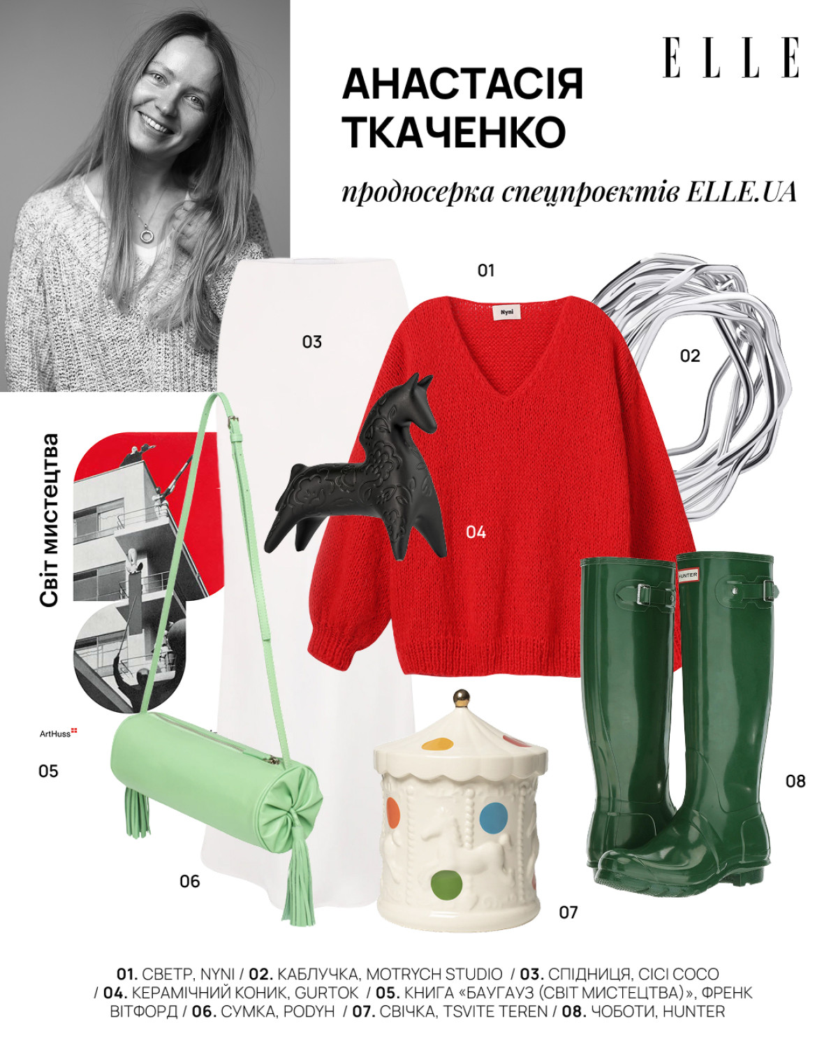 Як результат, у мене гармонійно склався комплект зі спідниці Cici Coco, светру ручного в’язання Nyni та чобіт Hunter. За грайливість відповідає сумка Podyh. Творчого самовираження додає каблучка Motrych Studio. В цьому образі запалюємо свічку Tsvite Teren з колекціїї ho-ho та всідаємося читати книгу «Баугаус (Світ мистецтва)». Ну і поринаємо в новорічний настрій у стилі «арт»!
