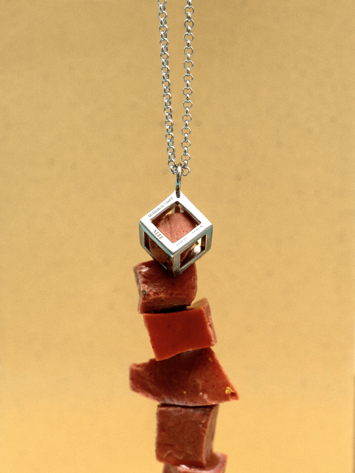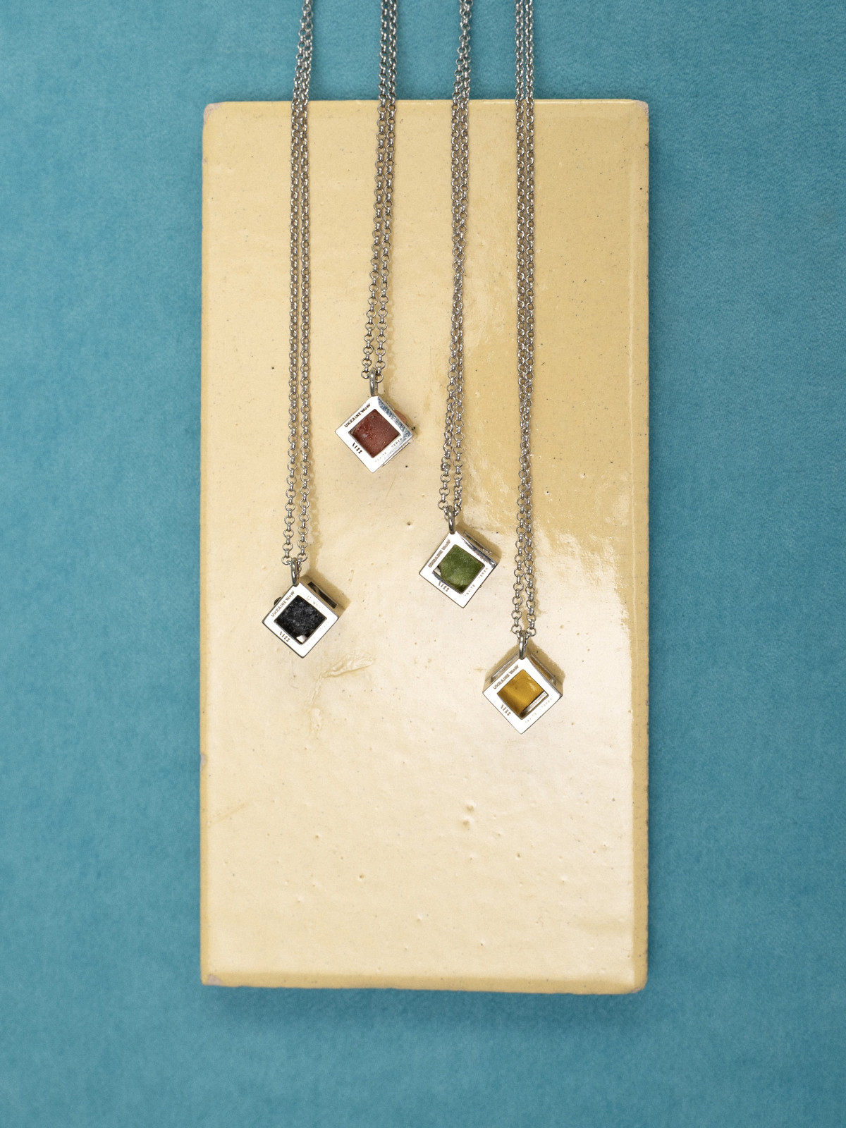 Підвіс SMALTA — це автентичне непрозоре скло у срібній оправі на довгому ланцюжку. Лінійка представлена чотирма кольорами: жовтим, зеленим, помаранчевим та чорним.