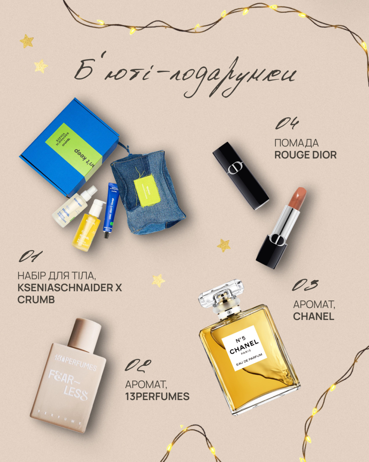 Однією з яскравих ідей цього сезону є косметичка, створена в колаборації українських брендів KSENIASCHNAIDER та Crumb. Виготовлена з деніму за методом апсайклінгу, вона поєднує стиль і екологічність. У наборі — три продукти з ексклюзивним дизайном та ароматом: крем для рук, олія і міст для тіла з теплими нотами бобів тонка, дуба та пачулі. Для тих, хто цінує символізм у подарунках, доречним варіантом стане аромат Fearless від 13 Perfumes. Замшевий, витончений і теплий, новий Fearless підкреслює силу характеру й безстрашність. Цей парфум, з його анімалістичними й деревними нотами, створений українцями для українців, які про сміливість і силу знають не з книжок. Класика, що завжди залишається поза часом, — аромати Chanel. Легендарний аромат Chanel №5 або помада Rouge Dior — елегантний вибір, який однаково доречно подарувати мамі, найкращій подрузі, колезі або, зрештою, собі.