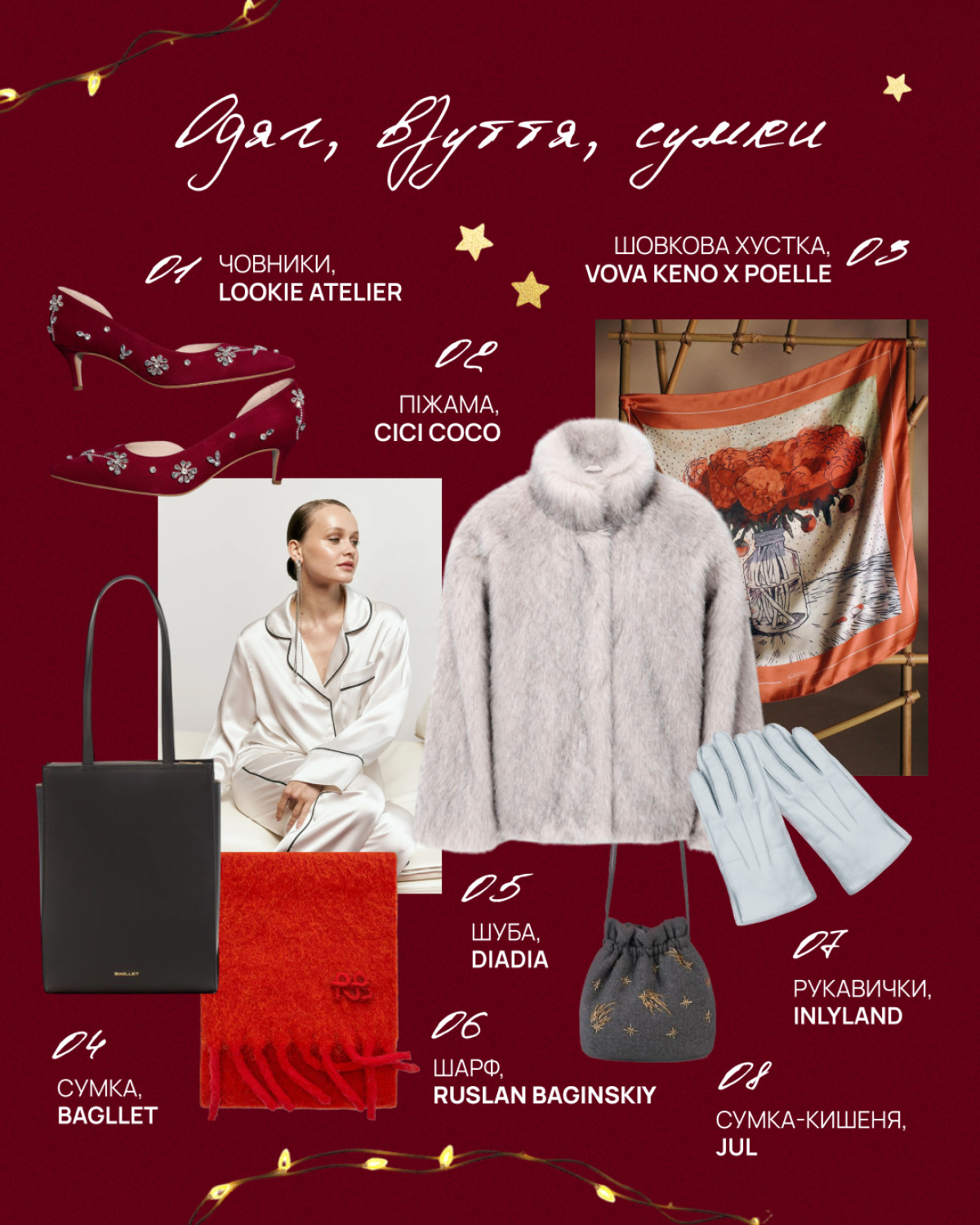 Шарф Ruslan Baginskiy яскраво-червоного кольору — справжній must-have прохолодного сезону. Структурована сумка Bagglet, в яку поміститься ноутбук і ще 1000 і 1 річ, поєднує функціональність і стиль та стане чудовим презентом як для чоловіків, так і для жінок. Ідея подарунка для найближчих — піжама з нової колекції CICI COCO. В ній можна зустрічати Новий рік (накинувши шубу з екохутра diadia), а можна стилізувати її з комфортним взуттям для повсякденних образів. Якщо ж, навпаки, хочеться додати магії й сяйва, червоні човники Lookie Atelier, всипані камінням, розкішно впораються з цим завданням.