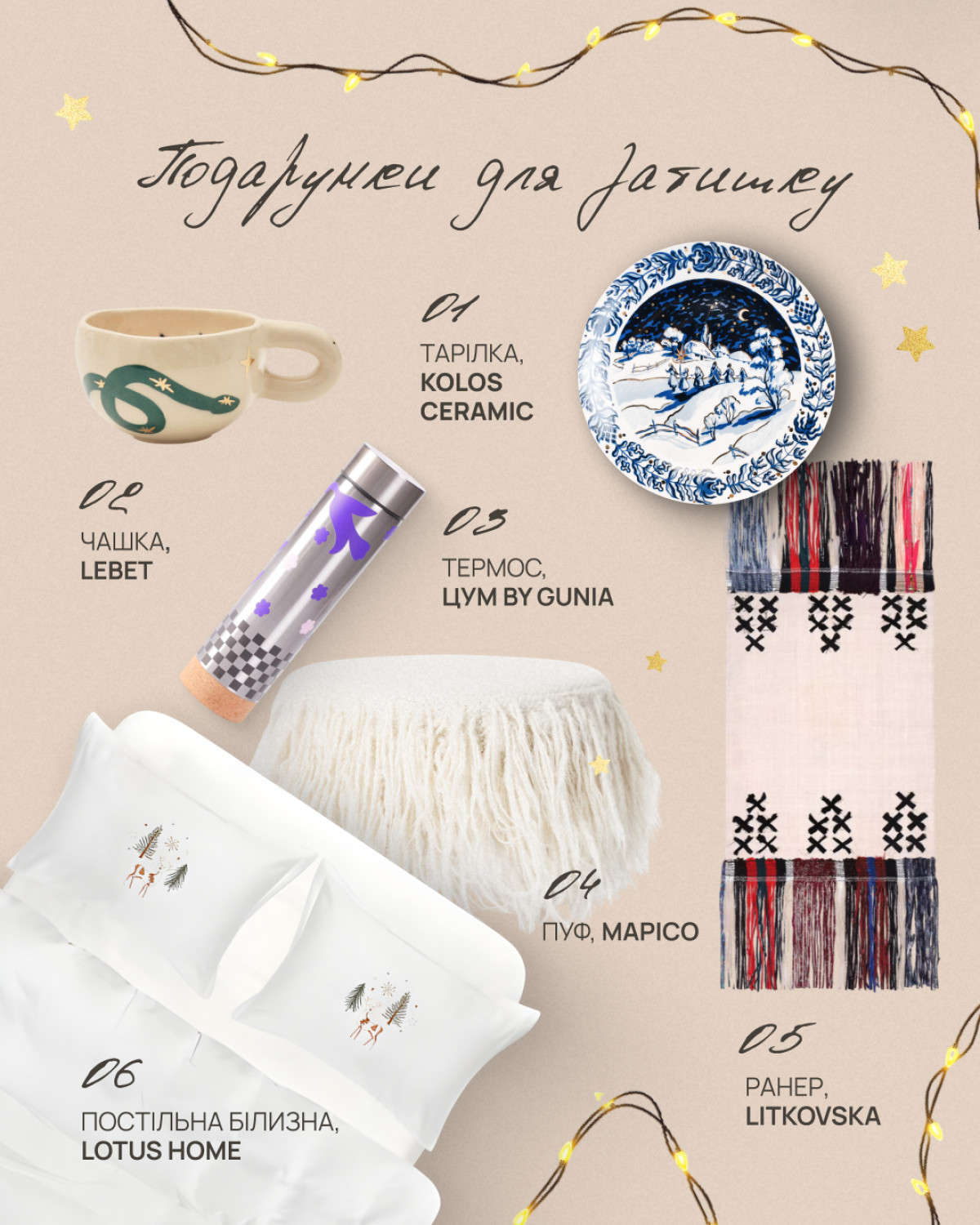 У передсвятковий період ми особливо цінуємо тепло та затишок, які створюють атмосферу справжнього родинного свята. Саме тому подарунки для дому — це завжди влучний вибір. Вони не лише приносять радість, а й залишаються з нами як приємне нагадування про особливі моменти. Цьогоріч серед фаворитів — поєднання символізму, естетики та практичності. Наприклад, чашка Lebet із зображенням змія, символу 2025 року, стане чудовим супутником зимових вечорів за гарячим напоєм. Її дизайн виконаний у стриманій, але виразній манері, що підкреслює тонкий смак. Не менш стильним подарунком є термос ЦУМ by Gunia, який поєднує елементи сучасного мистецтва та традиційних мотивів. Це ідеальне рішення для тих, хто завжди в русі, але цінує комфорт навіть під час прогулянки або подорожі. Для тих, хто хоче додати святкового акценту до свого інтер’єру, підійде ранер від Litkovska — вишуканий текстильний аксесуар, який перетворить будь-який стіл на об’єкт захоплення. А постільна білизна від Lotus Home із різдвяним орнаментом не лише стане прикрасою спальні, а й подарує справжнє відчуття затишку та тепла. І звісно, пуф від MAPICO — функціональний та стильний акцент для оселі, який можна використовувати як місце для відпочинку або декоративний елемент у вітальні.
