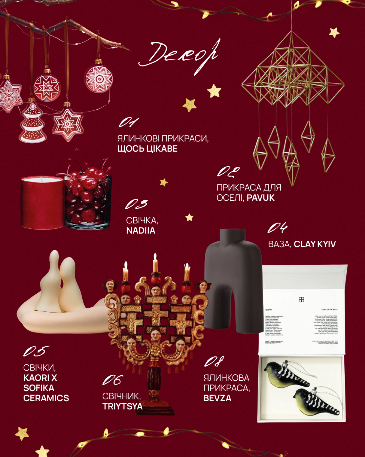 Свічки — абсолютний must-have зимового сезону, і вони можуть бути як стильним акцентом, так і символічним подарунком. Наприклад, свічки від українського бренду nadiia — це не лише про естетику, а й про сенс, адже їхнє м’яке світло наповнює простір затишком навіть у моменти темряви. Ще одна ідея — ялинкові прикраси, які зберігають українські традиції й можуть стати символом святкового настрою. Витончені вироби від бренду «Щось цікаве» чи унікальна прикраса «Щедрик» Bevza з національними мотивами прикрасять ялинку, додаючи їй сучасного звучання. А для тих, хто цінує ручні вироби, чудовим подарунком стане декор «Павук», який можна створити власноруч. Завершують список святкові вази нестандартних форм, як-от від Clay Kyiv, що стануть і артоб’єктом, і стильним акцентом будь-якої кімнати. Це подарунки, які наповнюють простір теплом, сенсами та красою, роблячи кожен момент вдома особливим.