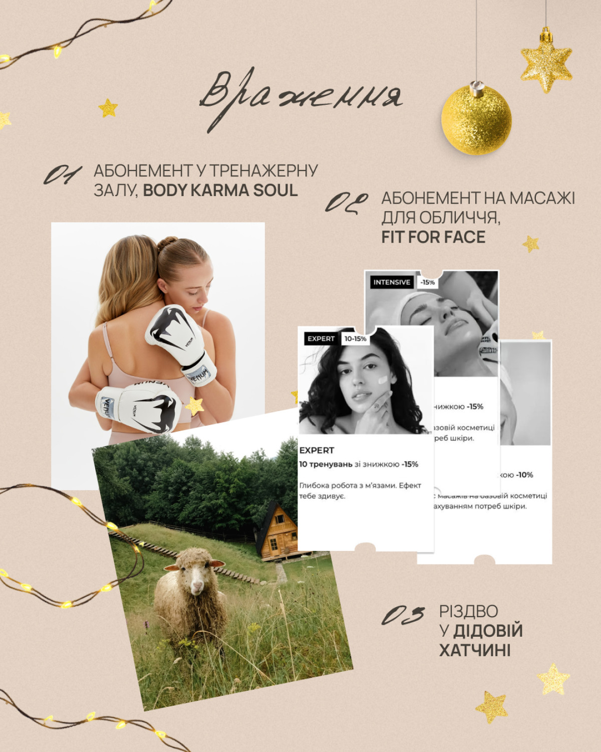 Подарунок у вигляді вражень — це турбота про тіло і душу, яка залишає яскраві спогади. Абонемент до спортивної зали — універсальний вибір для тих, хто цінує активний спосіб життя або хоче спробувати щось нове: від йоги до функціональних тренувань. Альтернативою може стати сертифікат на масажі для обличчя, які однаково актуальні і для чоловіків, і для жінок. Це не лише про догляд, а й про відновлення енергії. А для тих, хто потребує повного перезавантаження, ідеальним подарунком стане відпочинок, як-от тематична програма в «Дідовій хатчині» на Івано-Франківщині.