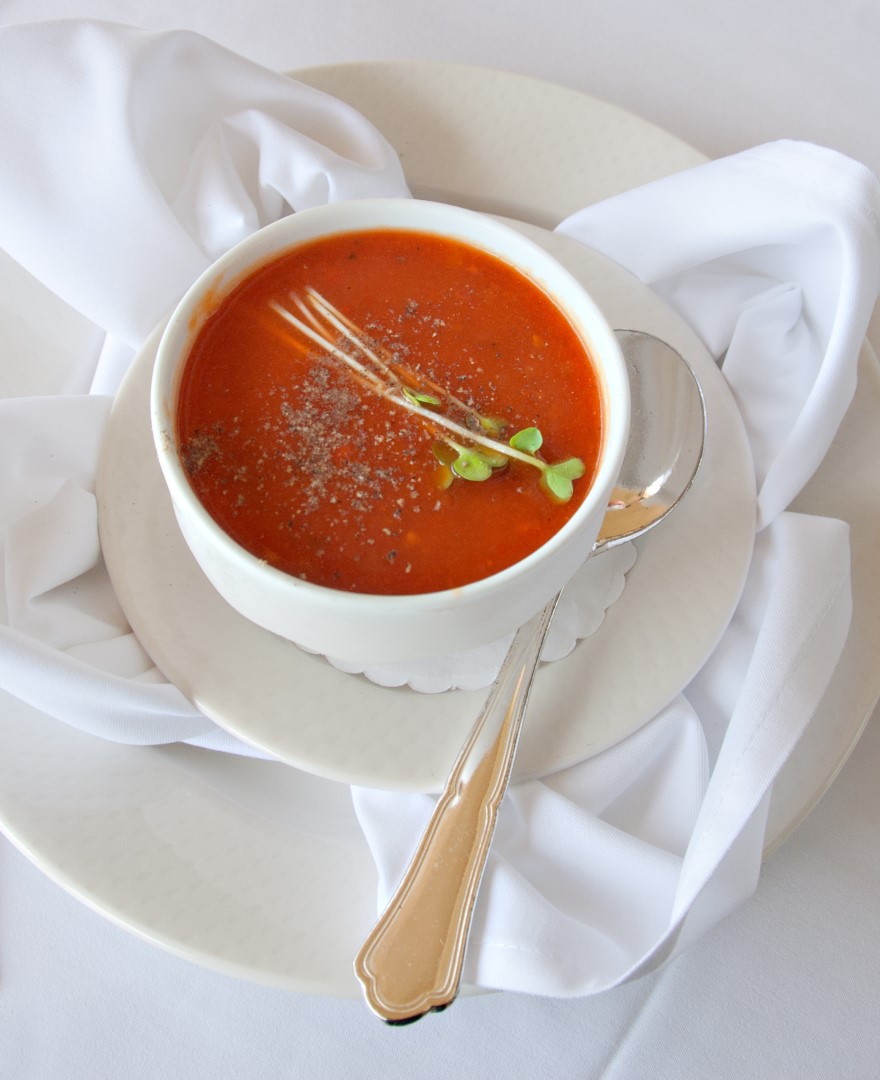 Совет Оксаны: к холодному гаспачо прекрасно подойдут сухарики, порезанные кубиками огурцы, вареное яйцо, хамон или каперсы.