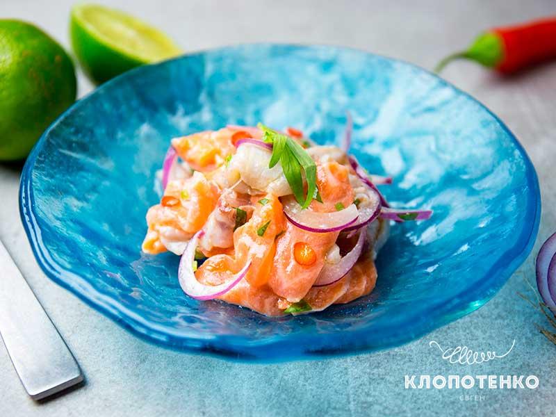 2. Филе лосося зачистите от кожуры и порежьте на такие же куски, как сибас. В небольшую емкость переложите филе сибаса и лосося, добавьте перец чили, лук и зелень. Залейте соком лайма и оливковым маслом. Соль добавляйте по вкусу. Поставьте закуску в холодильник на 15 минут, а затем подавайте.