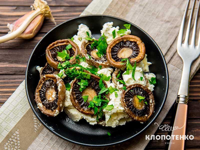 1. Перед приготовлением разогрейте духовку до 180 градусов. Грибы нужно помыть и срезать ножки от шляпок. Ножки нам не нужны, но можете использовать их в других блюдах. Застелите противень пергаментом и положите на него шляпки грибов. Полейте шампиньоны оливковым маслом и запекайте 15-20 минут. По готовности дайте грибам остыть.