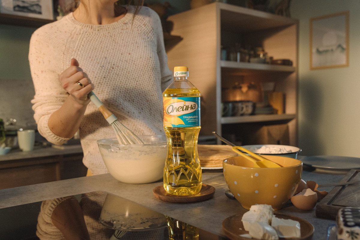 Потім з’єднуємо отриману масу з рештою кефіру, двома яйцями кімнатної температури та рафінованою соняшниковою олією «Олейна».