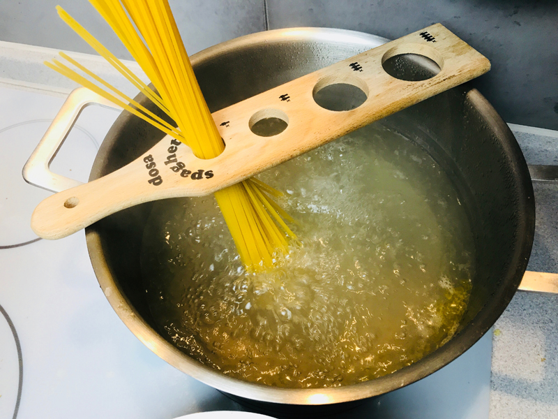 2. Отвариваем спагетти в подсоленной воде. Я всегда пользуюсь одной пропорцией – на 1 литр воды 100 грамм макарон и 10 г соли. Пасту необходимо отваривать на 1 минуту меньше, чем указано на упаковке.