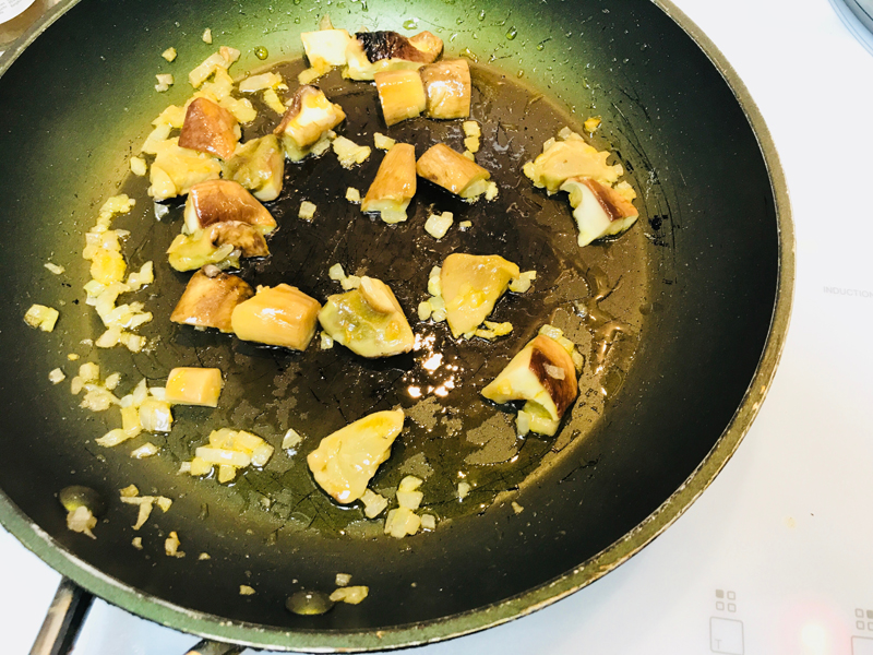 3. Лук мелко режем и обжариваем на сковороде с небольшим количеством оливкового масла, до тех пор он не станет прозрачным. Добавляем вторую половину грибов и обжариваем еще несколько минут. Добавляем щепотку соли.