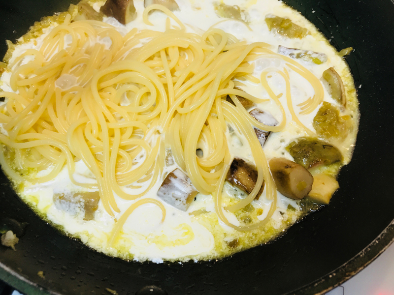 5. Добавляем сливки и спагетти и тушим еще 2 минуты. Перед подачей на стол добавляем тертый пармезан, измельченные листики мяты и свежемолотый перец.