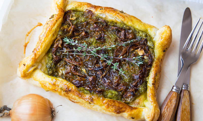На размороженное тесто выложите гороховую начинку и сделайте бортики толщиной 1 см. Сверху на горох выложите карамелизированный лук, бортики смажьте взбитым яйцом и отправьте запекаться в духовку на 15-20 минут.