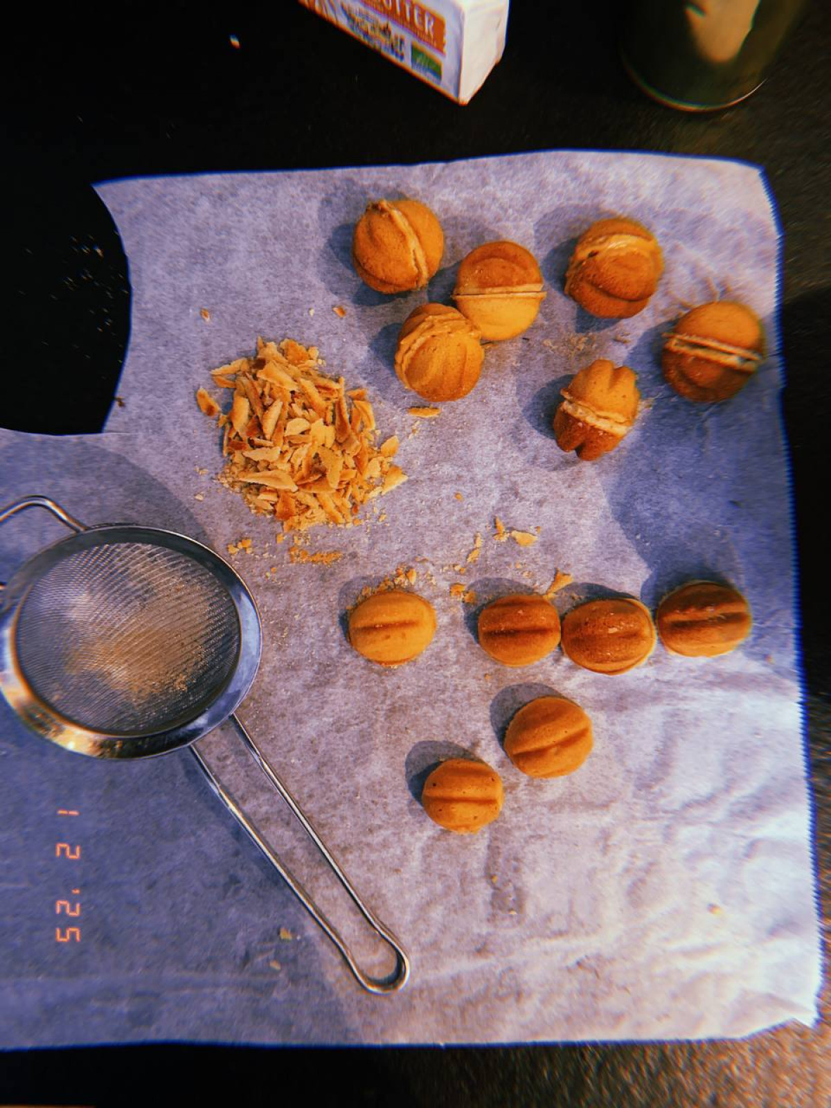 - Наповнюємо половинки начинкою, в одну додаємо обсмажений волоський горіх та збираємо горішки.