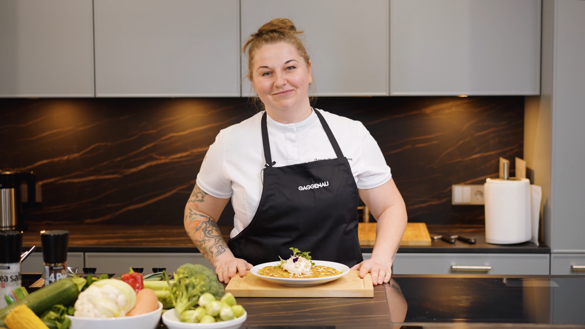 На кухні технічного партнера GAGGENAU вона пропонує приготувати сезонну їжу — овочевий оладок з лабне. Лише 15 хв — і легка, поживна та дуже смачна страва готова.