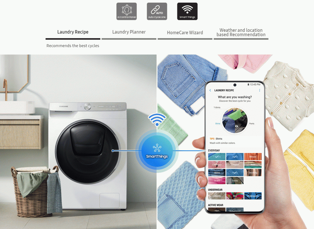Новая линейка стиральных машин Samsung — это точно шаг в будущее. Каждая будет оснащена дисплеем и встроенным искусственным интеллектом AI control. Что это значит? Например, машинка сама запоминает и предлагает наиболее часто используемые циклы и любимые настройки для стирки. Специальное приложение для смартфона SmartThings организует стирку, подсказывая оптимальные циклы, и поможет контролировать процесс. А еще — умная сушка: по окончанию цикла стирки сушка сама подберет соответствующий вид сушки.