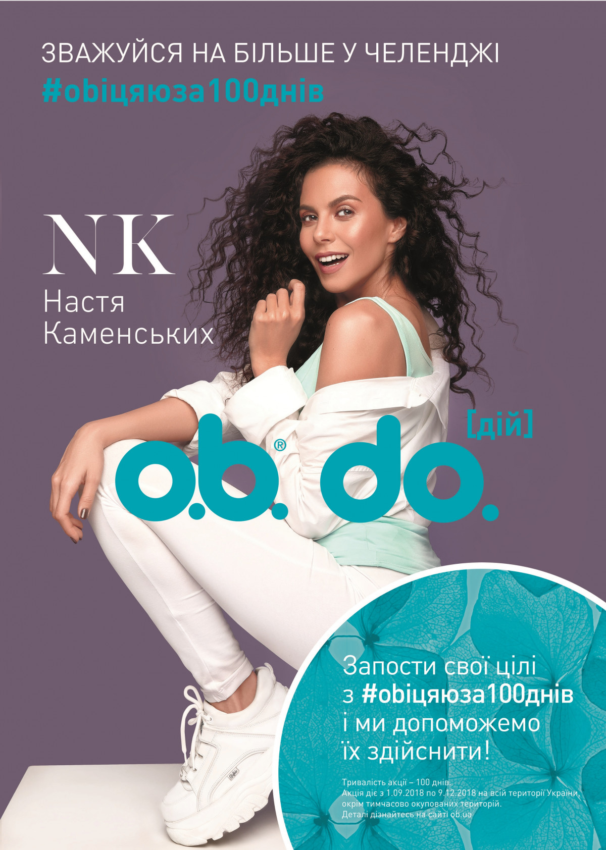 Чтобы вдохновить окружающих на новые свершения, бренд o.b. и Настя Каменских запускают новый проект о мотивации и действии под названием #ObiцяюЗа100днів. Он объединит всех, кто стремится расти над собой, но нуждается в поддержке. В течение 100 дней Настя поставит 14 целей, которых постарается достичь до завершения проекта. На своей страничке в сети Инстаграм она будет делиться своими успехами, поддерживать участников и отчитываться о промежуточных результатах.