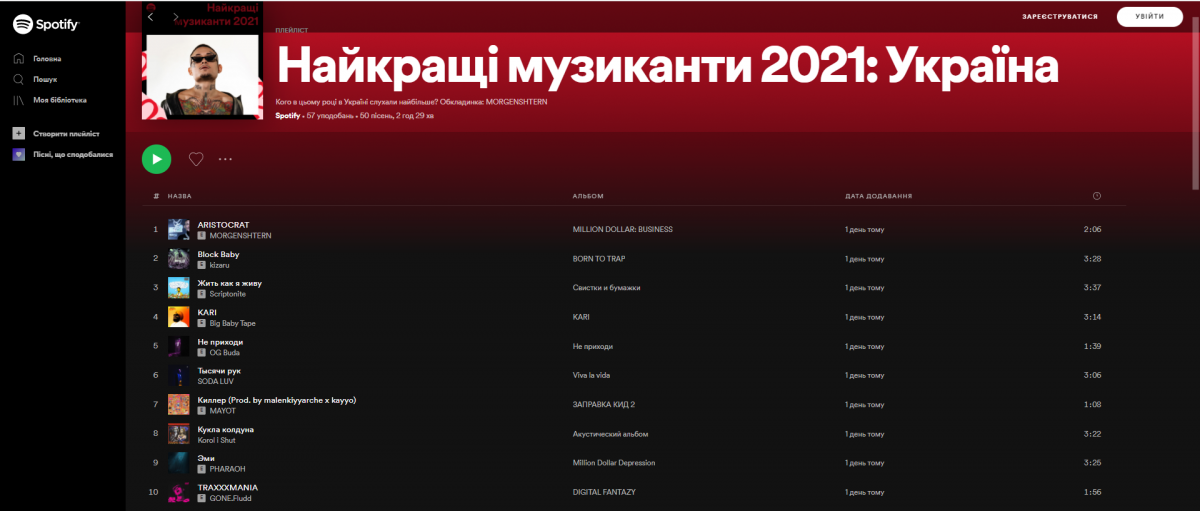 Стримінговий сервіс Spotify опублікував рейтинги для України в 5 категоріях: «Найкращі треки», «Найкращі музиканти», «Топ артистів», «Топ артисток» та «Топ гуртів». Найчастіше у 2021 році українці слухали російських виконавців та російськомовні пісні.