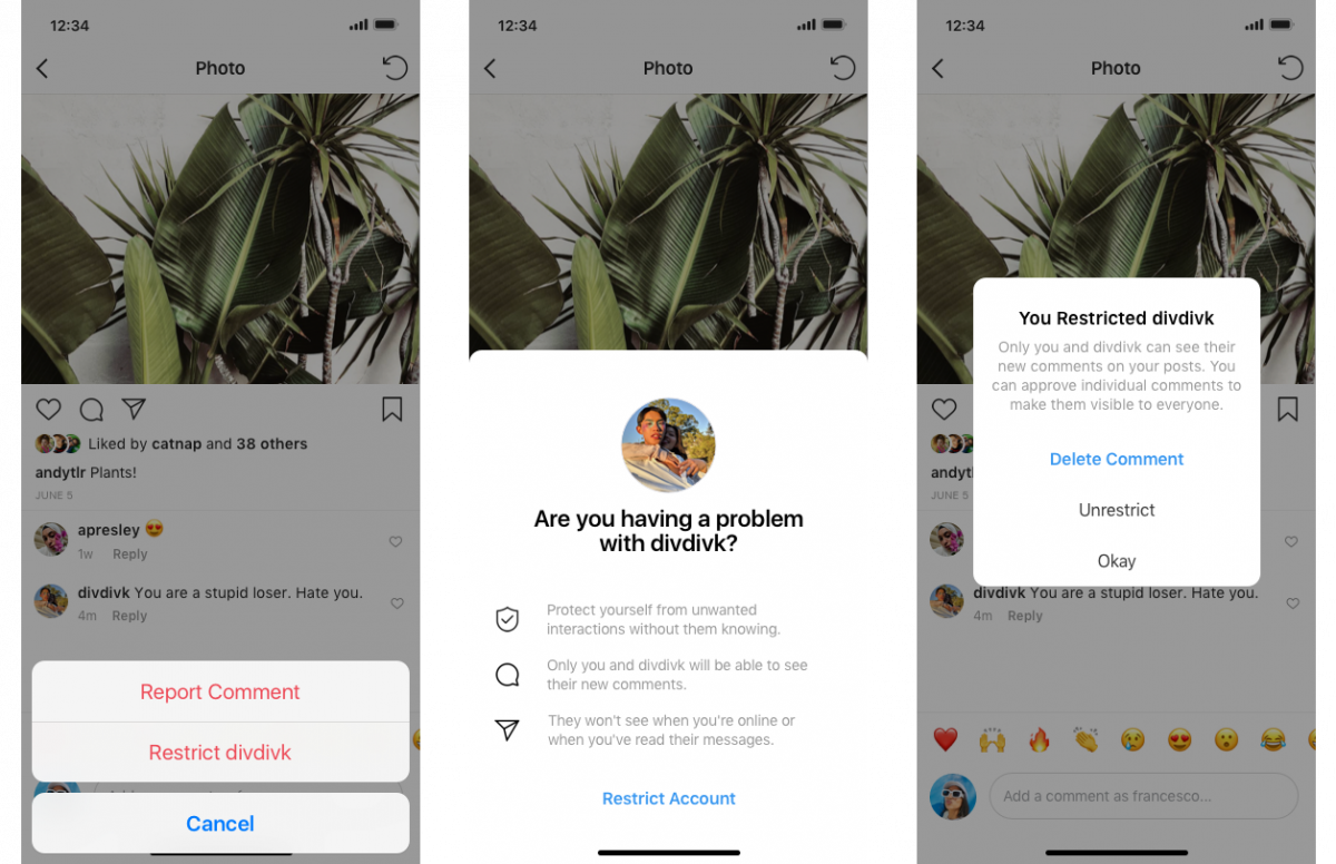 В Instagram отмечают, что отписка или блокировка — не всегда могут быть лучшим выходом. Ведь в реальной жизни нам часто приходится взаимодействовать с большей частью своих подписчиков. Поэтому соцсеть вводит опцию Restrict. Она позволит людям контролировать комментарии в своем аккаунте, не уведомляя об этом их авторов. Таким образом, комментарий будет видеть только человек, который его оставил.