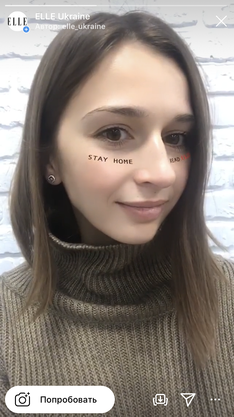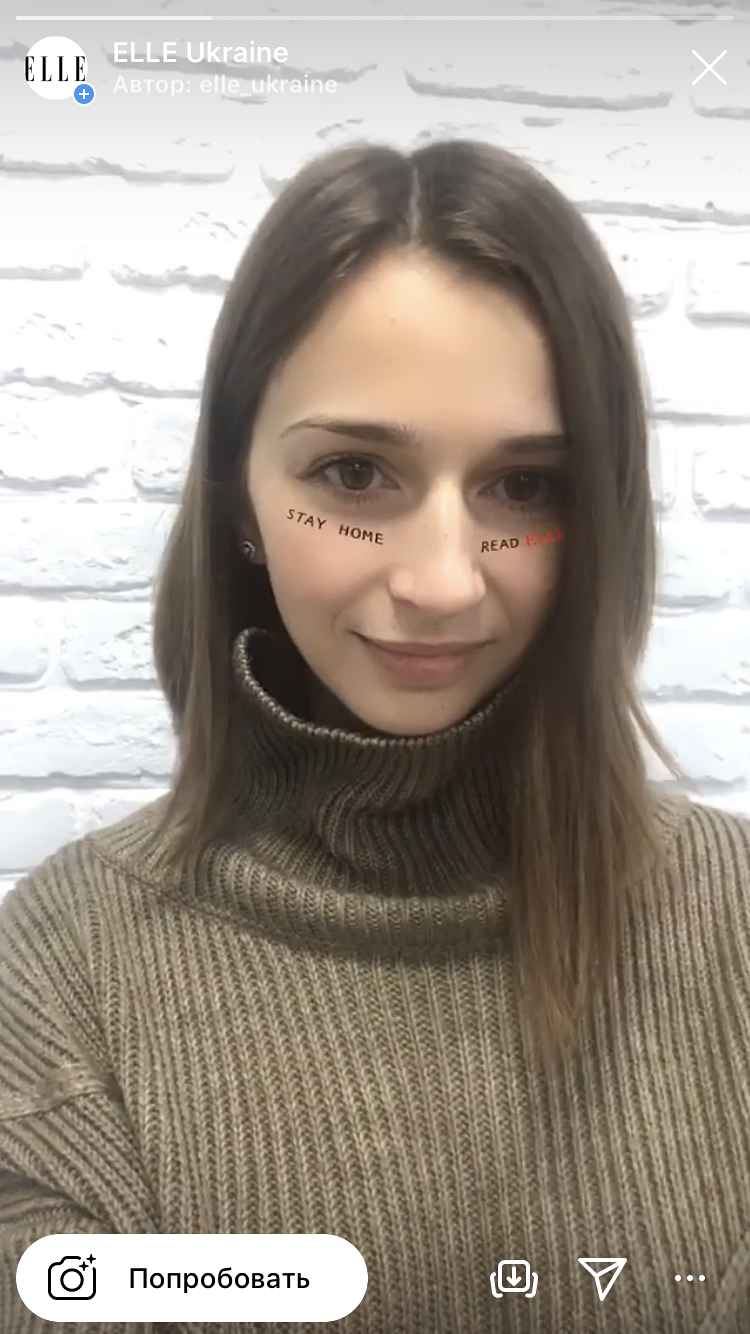 В Instagram появилась именная маска ELLE Украина. На ее создание нас побудили события в мире, а именно — пандемия коронавируса, в связи с которой все мы оказались в изоляции. Карантин — единственный способ сегодня остановить распространение вируса. Наше издание призывает всех оставаться дома и провести это время с пользой: выучить язык, пройти онлайн-курс, читать любимые порталы.