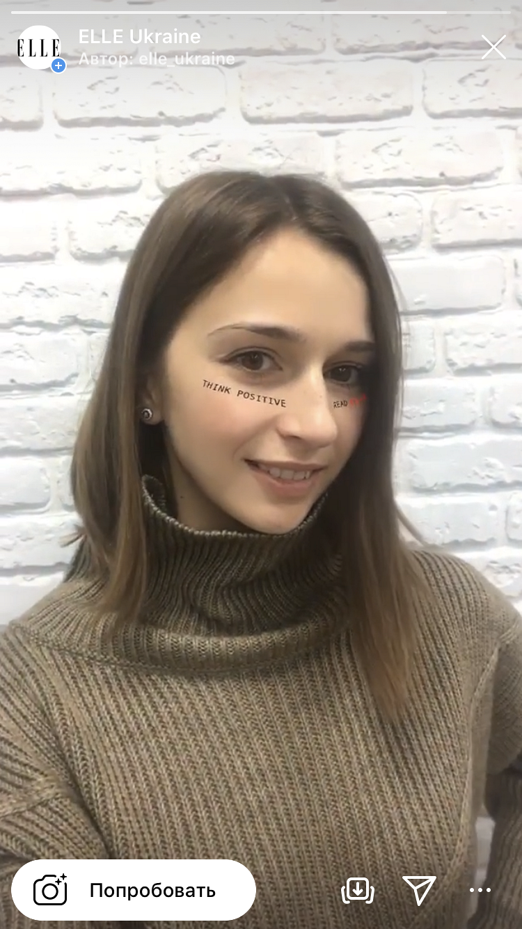 Этому и посвящена наша маска, главные слоганы которой — Stay home and read ELLE, Think positive and read ELLE. Чтобы воспользоваться ею, нужно быть подписанным на журнал в соцсети.