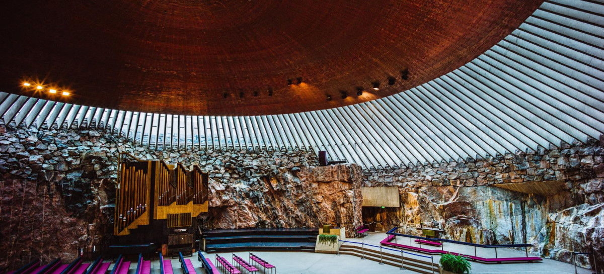 Какую бы веру вы ни исповедовали, обязательно зайдите в необычную и самую посещаемую церковь — Темппелиаукио. Приближаясь к ней, будьте уверены — вы заходите в протестантскую кирху, а не в бункер. Церковь накрыта медно-стеклянным куполом и на самом деле расположена в толще скалы. Необработанные каменные стены обеспечивают идеальную акустику, здесь постоянно устраивают концерты классической органной музыки, а в начале нулевых состоялась первая в Финляндии металмесса. Богослужения проводятся каждый день на финском и английском языках, а в церковных песнопениях могут принять участие все желающие.