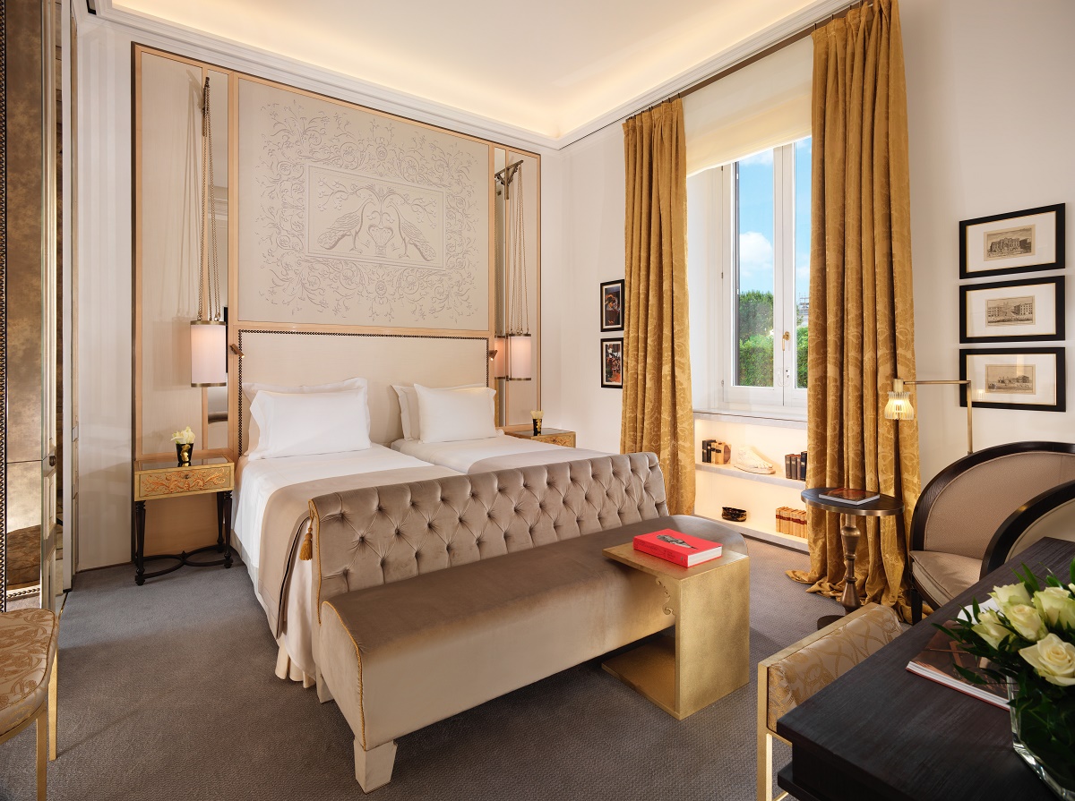 После масштабной реновации под руководством французского архитектора Брюно Мойнара исторические связи проявились еще сильнее: геометрический рисунок на черно-белом мраморном полу — как в палаццо римской знати, ковры в лобби повторяют узоры мозаики в термах Каракаллы, на стенах — фрески ручной работы в стилистике Ренессанса и абстрактные картины, в нишах — вазы, выполненные по заказу в старинной технике на острове Мурано.